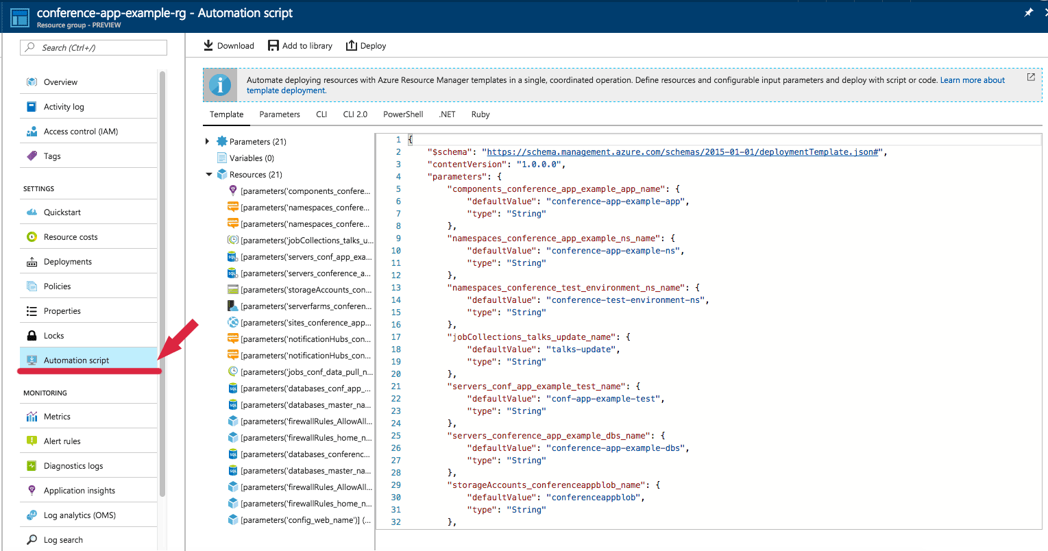 In the Azure cloud, resources are grouped together in Resource Groups. Typically, Resource Groups are tied to a specific region, but they can span multiple regions. Azure creates ARM templates that are available through the portal under the “Automation script” blade or vertical tab inside of your Resource Group. This blade provides a parameterized ARM template for the user and scripts to run the template with CLI, PowerShell, .NET, or Ruby.