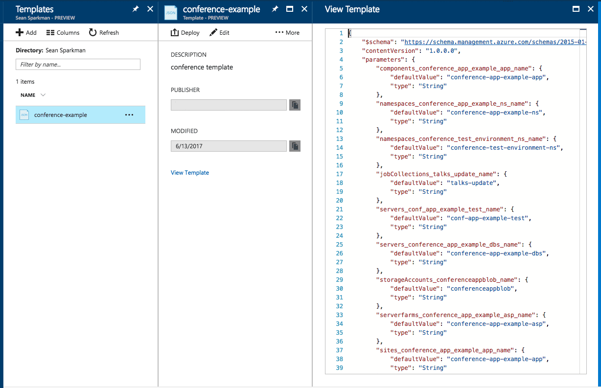 Once it’s saved there, you can use it to create more resources in Azure. Click on the “More Services” button to open the services blade. Scroll down to the bottom to find the “Template” button. The portal will provide you with a list of the templates you have saved. Select the template you wish to use. It will now show you the template itself as one file.
