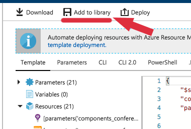 Generated templates are great, because you can save the template to your library in the Azure portal. On the “Automation script” blade, select the “Add to Library” button to save the template. The portal will take you to a screen with name and description fields. Fill them in and click “Save”. If this is the first time you’ve saved something, it may take a few moments for Azure to create your library. There’s a chance you will need to click “Save” again. Now your Resource Group template is saved in the Azure portal.