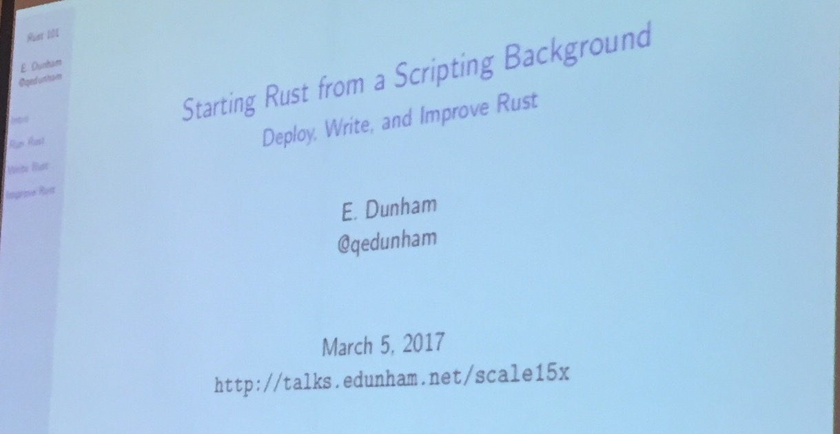 First up, I saw E Dunham's awesome "Starting Rust from a Scripting Background" talk. (video) She covered a huge amount of material in her alloted hour, and generated a large number of questions from the audience. She also effortlessly answered all of those questions, on the fly. If you've ever fielded talk questions, you understand just how hard it is to deal with an unexpected question, particularly if the premise of the question is flawed (which happens). E made it look easy (and I am so envious!)